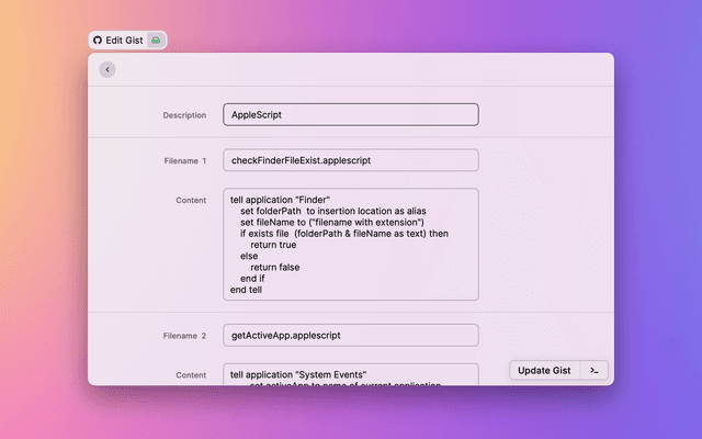 Automatically get the selected text or clipboard and generate a gistfile, you can also add additional gistfiles and finally create a gist. Once created successfully, you can choose to copy the link or open it in your browser.