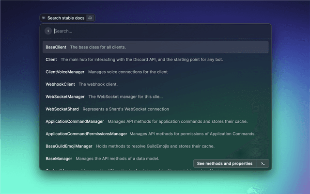 Quickly search through discordjs documentation with fuzzy search.